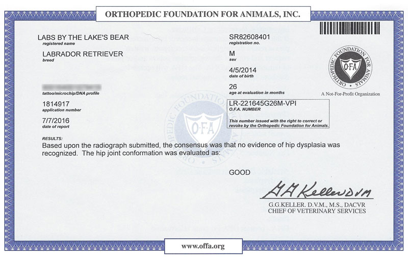 OFA + (the dog's age in months when certified) + (grade)